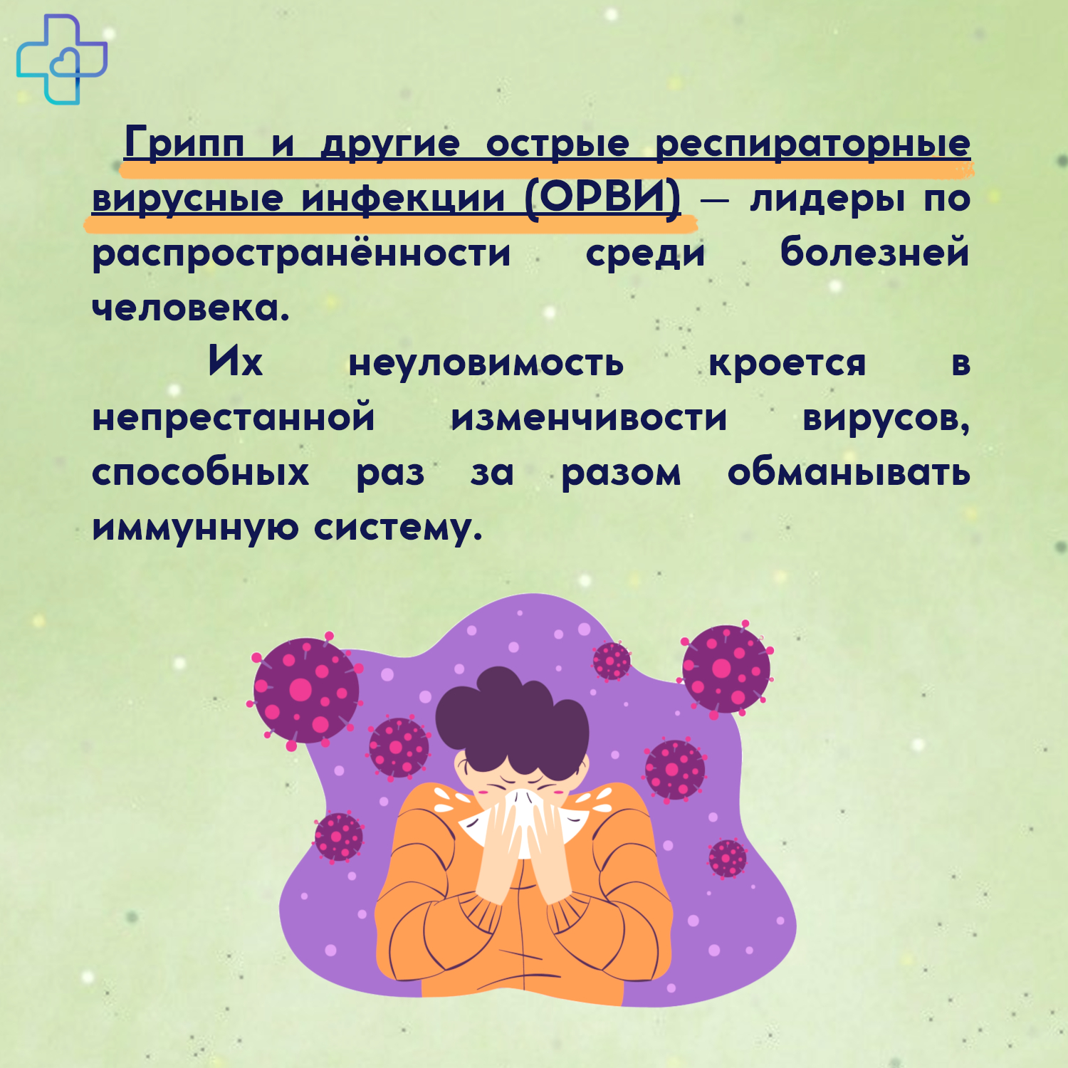Грипп и другие острые респираторные вирусные инфекции (ОРВИ) – лидеры по распространённости среди болезней человека. Их неуловимость кроется в непрестанной изменчивости вирусов, способных раз за разом обманывать иммунную систему. Даже пережив грипп, мы остаёмся уязвимыми, ведь против нового, мутировавшего вируса наш организм ещё не успел выстроить защиту.