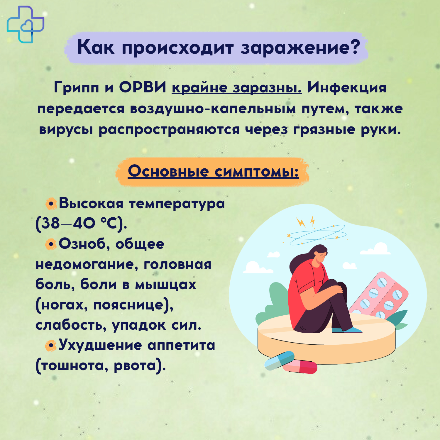 Грипп и ОРВИ крайне заразны. Инфекция передается воздушно-капельным путем, также вирусы распространяются через грязные руки.
