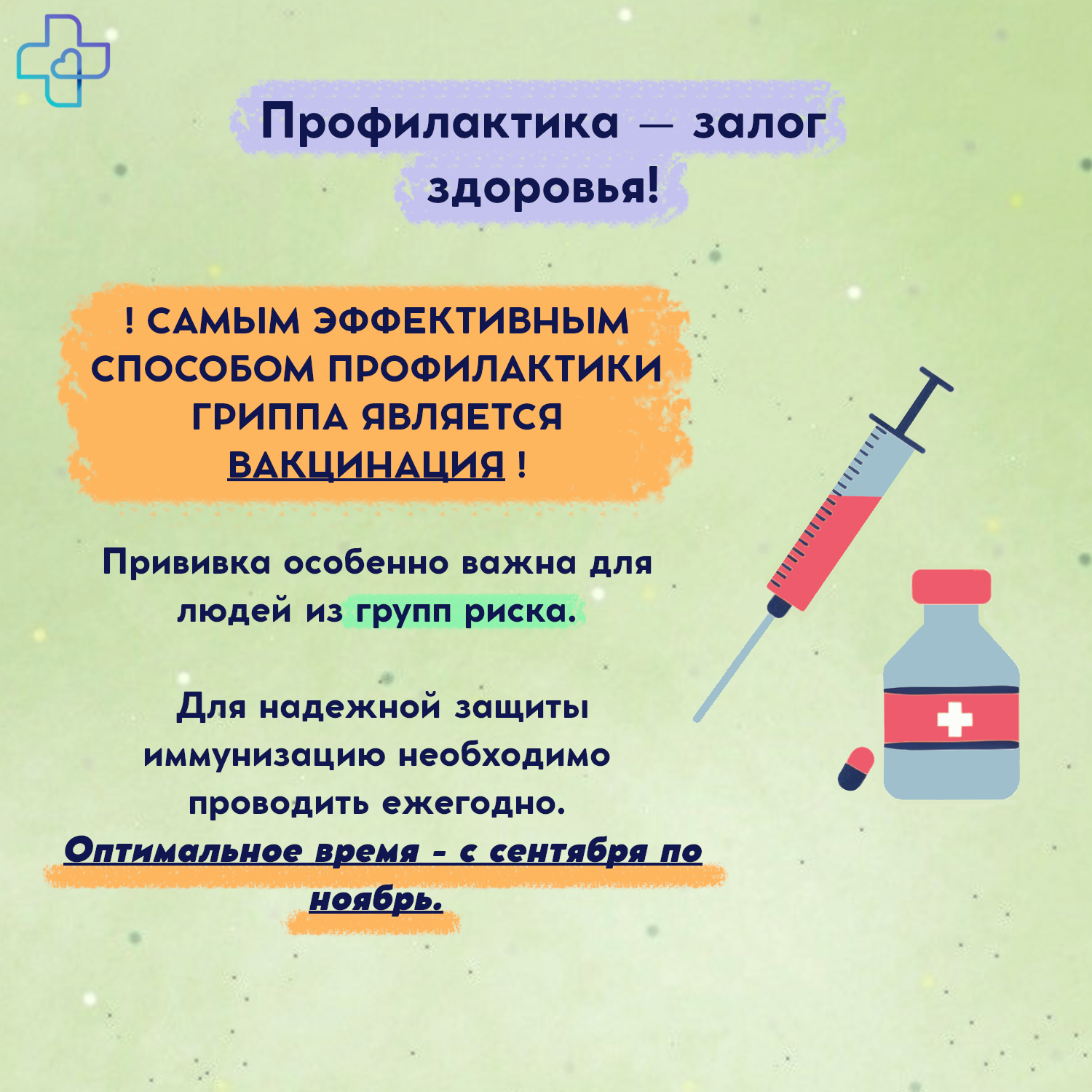 Вакцинация особенно важна для людей из групп риска. Детей против гриппа можно прививать с шести месяцев. Для надежной защиты вакцинацию необходимо проводить ежегодно.Оптимальное время с сентября по ноябрь.